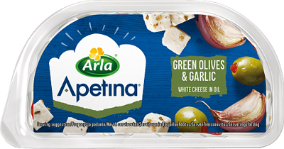 Välimerellisiä juustokuutioita, vihreitä oliiveja ja valkosipulia öljymarinadissa. Vähälaktoosinen, laktoosia <0,5g/100g. Voimakassuolainen.
