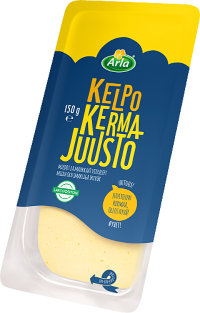 Täyteläisen herkullinen Kelpo kermajuusto valmiina viipaleina sopivan kokoisessa pakkauksessa.