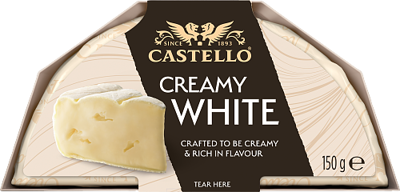 Castello White on kauttaaltaan täyteläisen kermainen brie-tyylinen valkohomejuusto. Hento ja hieno homehuntu, täydellinen suutuntuma. Pehmeä, runsasrasvainen, pinnalta ja sisältä homekypsytetty. Laktoositon. Voimakassuolainen.
