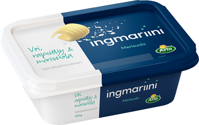 Ingmariinin herkullisen maun resepti on yksinkertainen. Voita, hieman rapsiöljyä ja ripaus merisuolaa. Lisäaineeton, koska mitäs sitä hyvään mitään lisäämään. Leivän päälle, leivontaan ja paistamiseen. Nauti sinäkin. Voimakassuolainen. Laktoosi 0,5 g / 100 g.